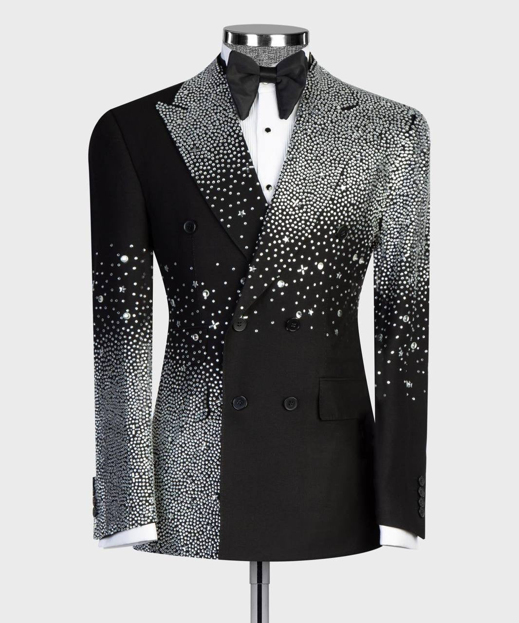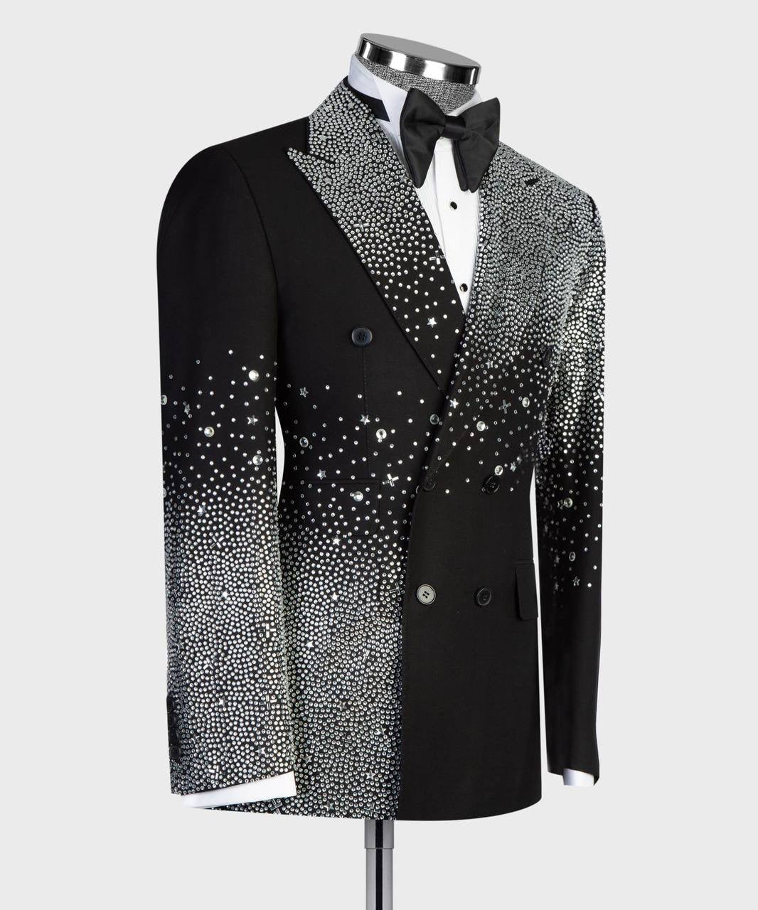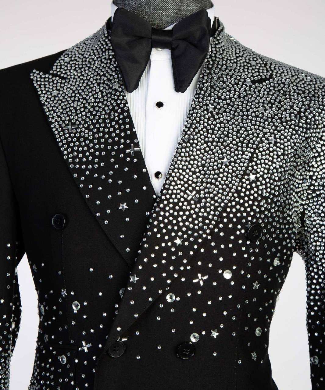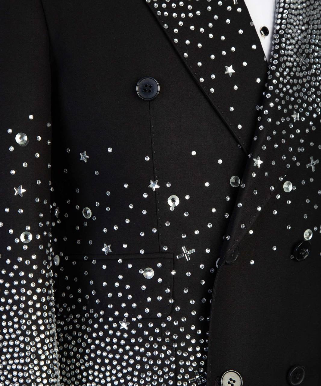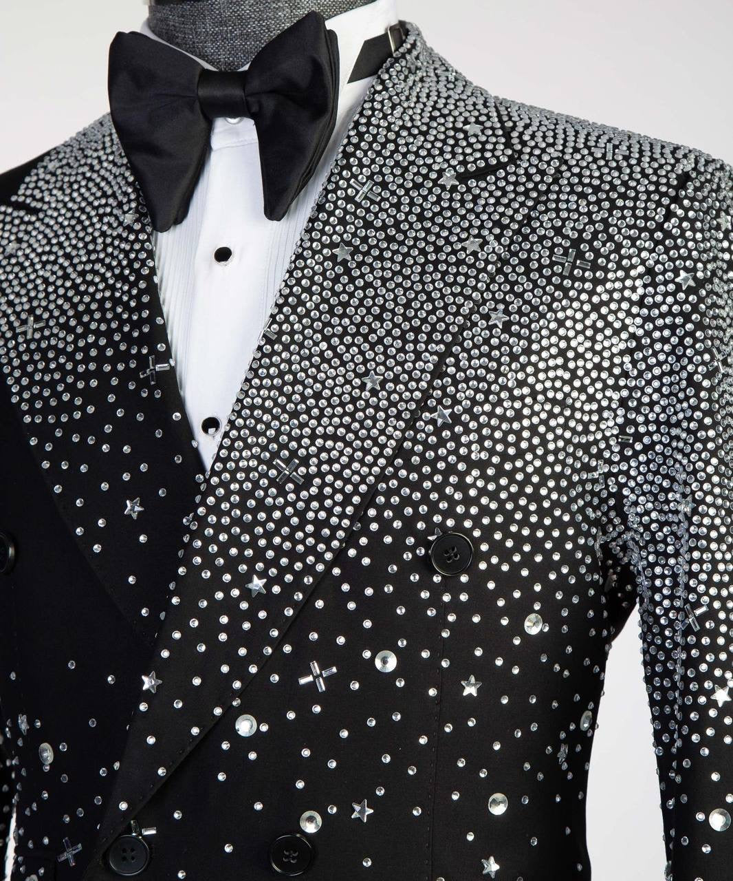 An expertly tailored tuxedo by JM Menswear,Created in virgin wool with natural stretch for wearing comfort. Trimmed with silk accents at the lapels, pocket and pant side seams, this three-pieces tuxedo is cut to a defined fit for a modern silhouette, silk-covered buttons add the finishing touch to this timeless ensemble