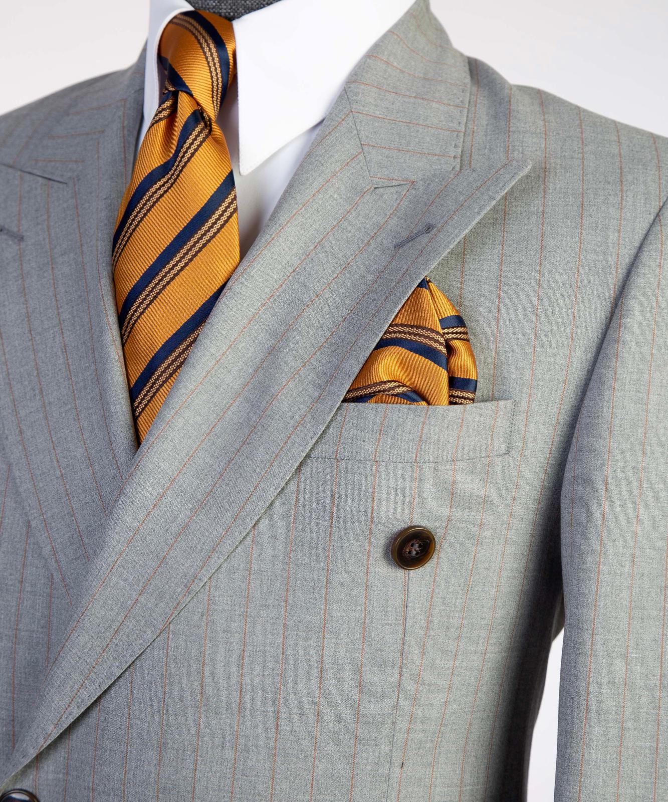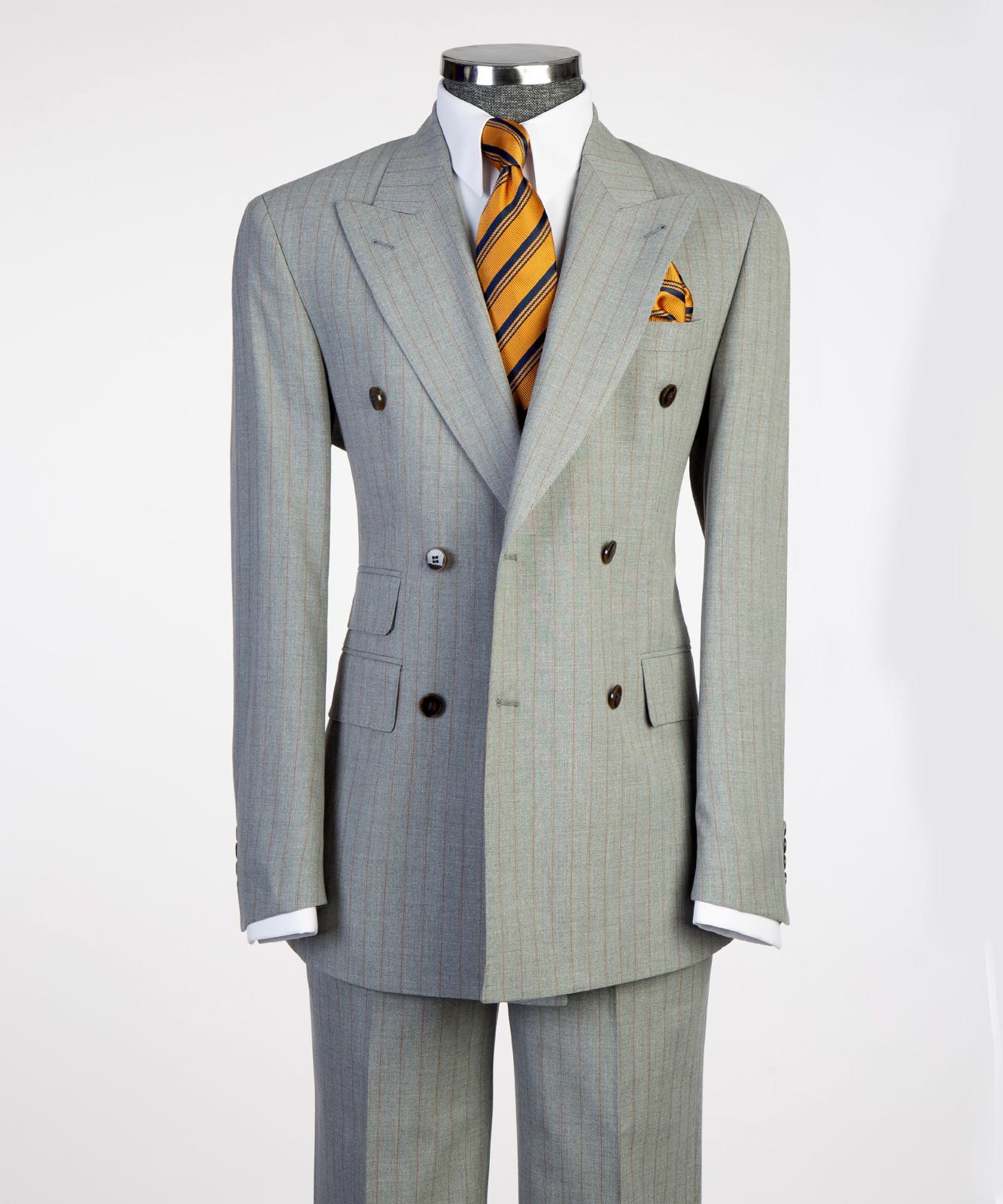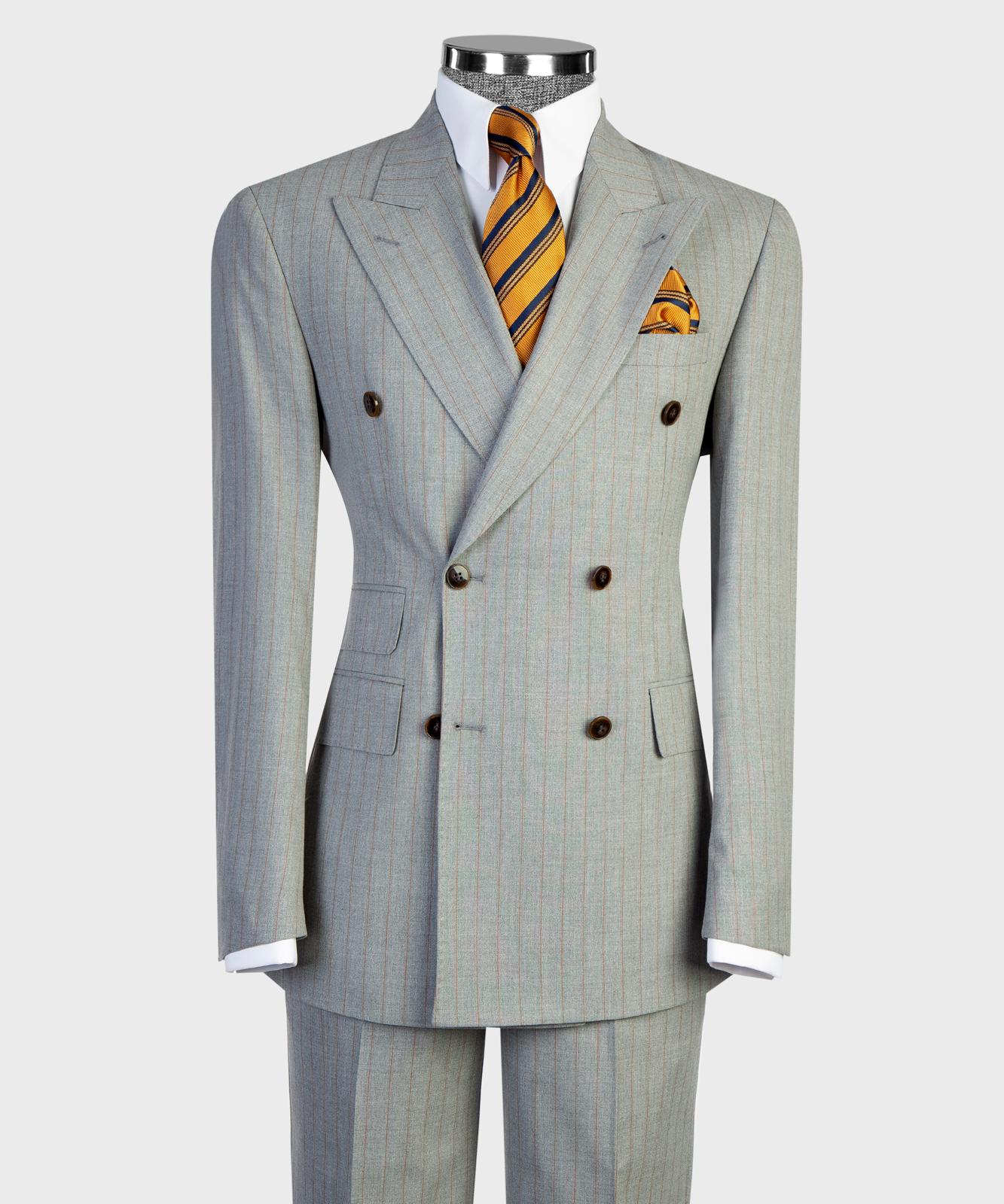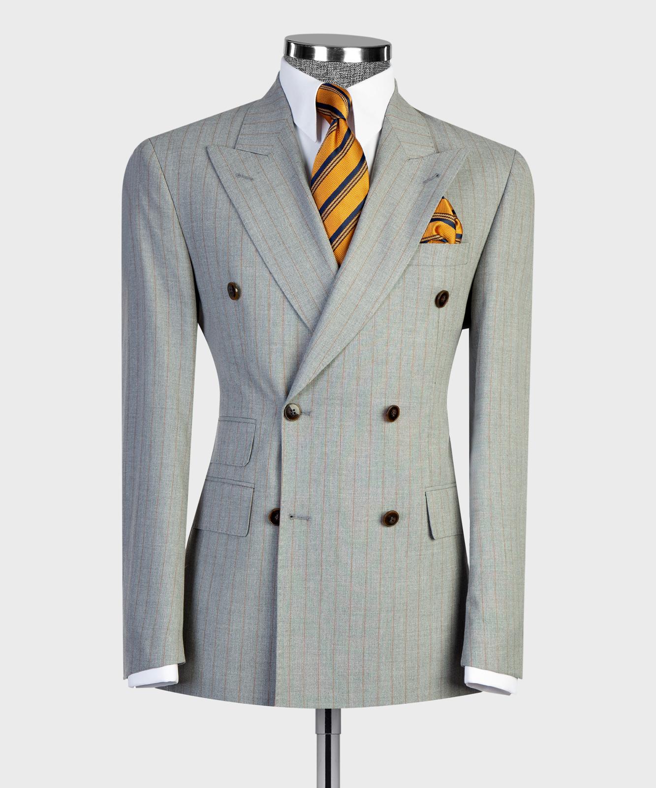 Elevate your style with this sophisticated double-breasted suit, featuring a sharp Italian peak lapel for a refined and commanding presence. The matching pinstripe trousers complete the look with seamless harmony. Designed in a slim fit silhouette, it offers both elegance and comfort. Crafted from high-quality wool fabric, this suit delivers exceptional durability, breathability, and a luxurious feel. A timeless piece for the modern gentleman.
