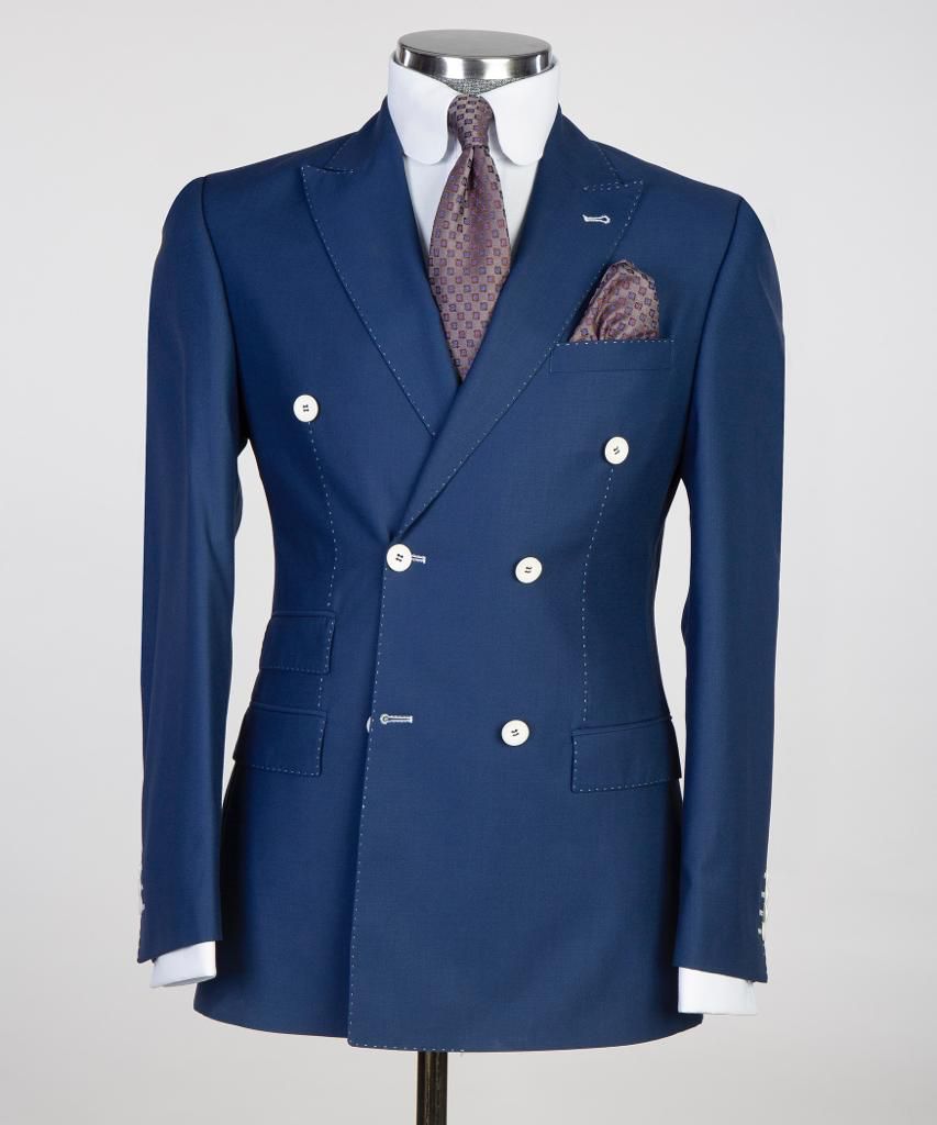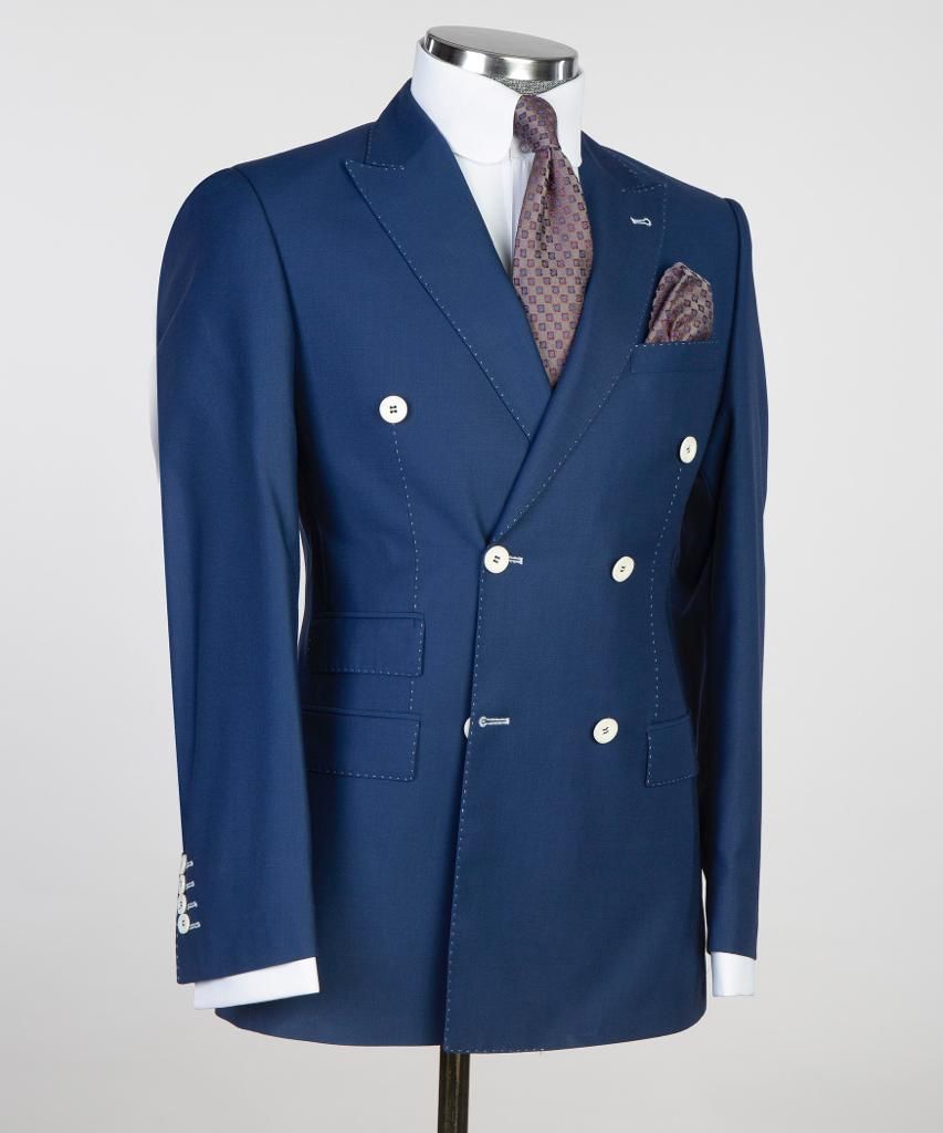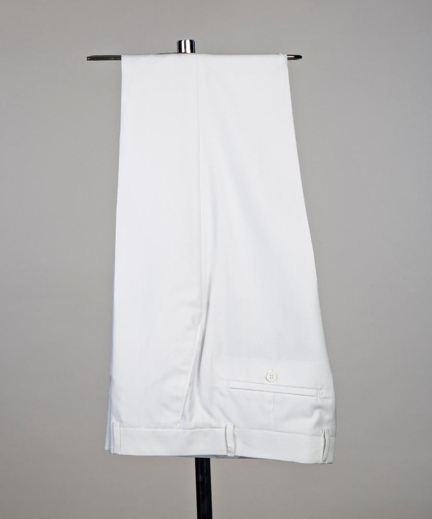 Jacket hii nyembamba inayolingana na matiti mawili inakuja na suruali nyeupe.