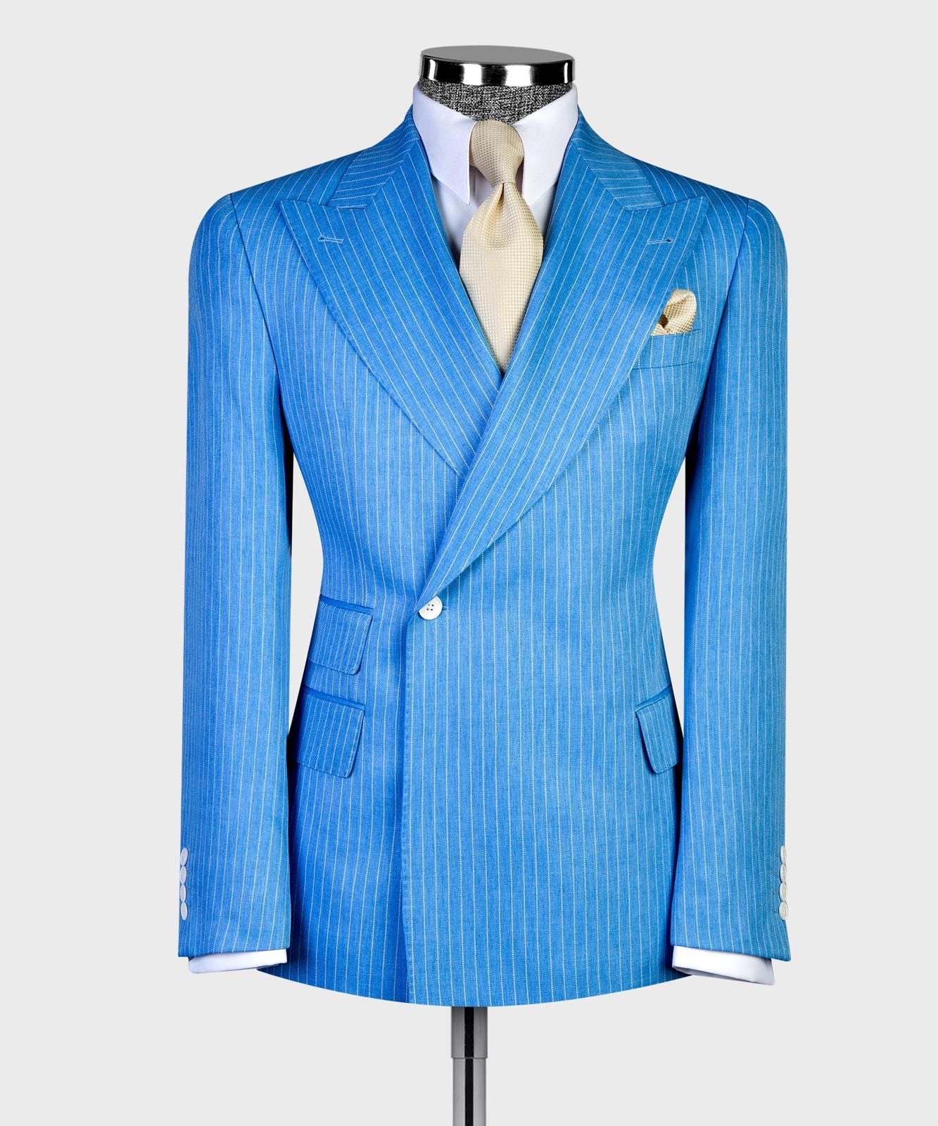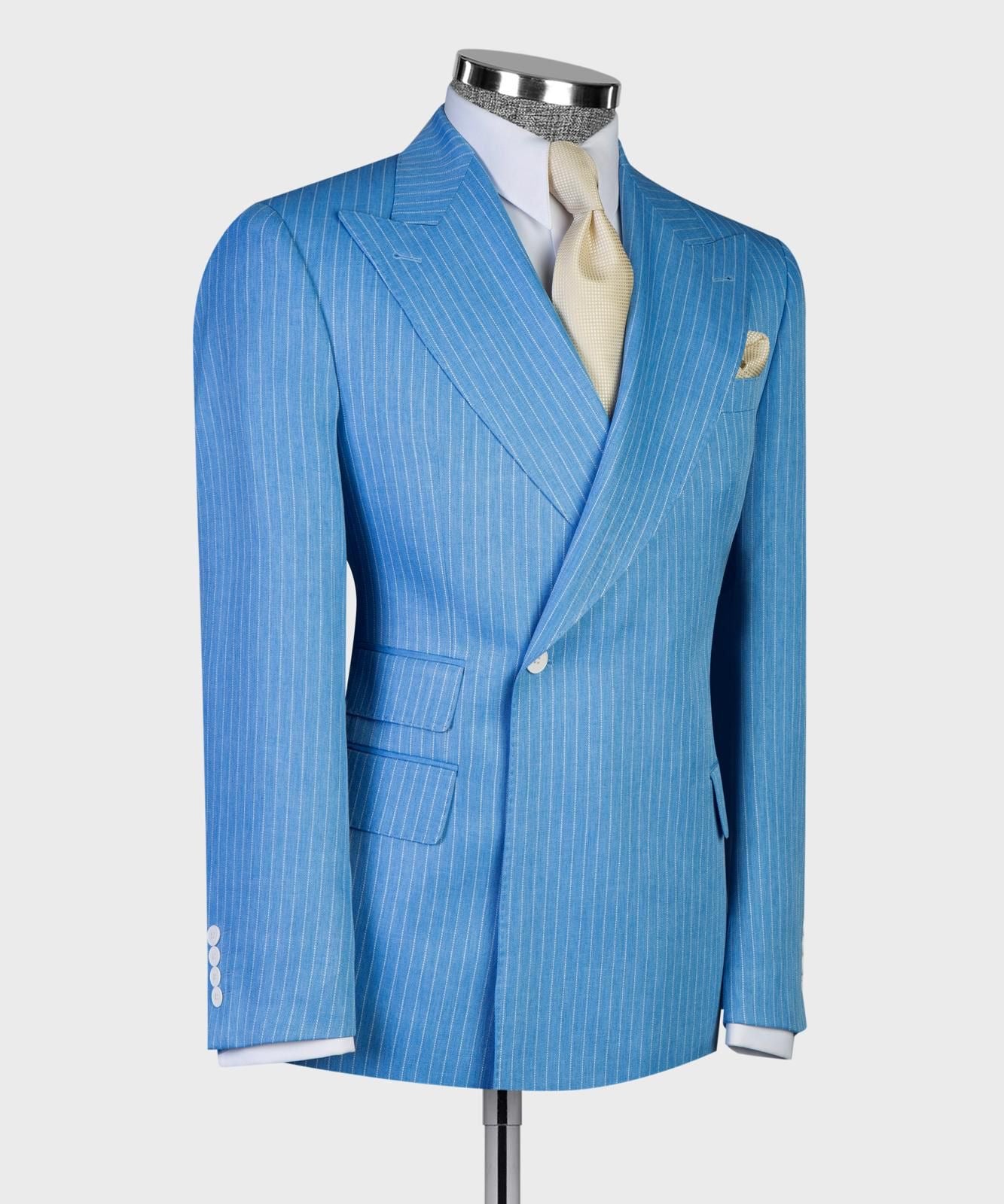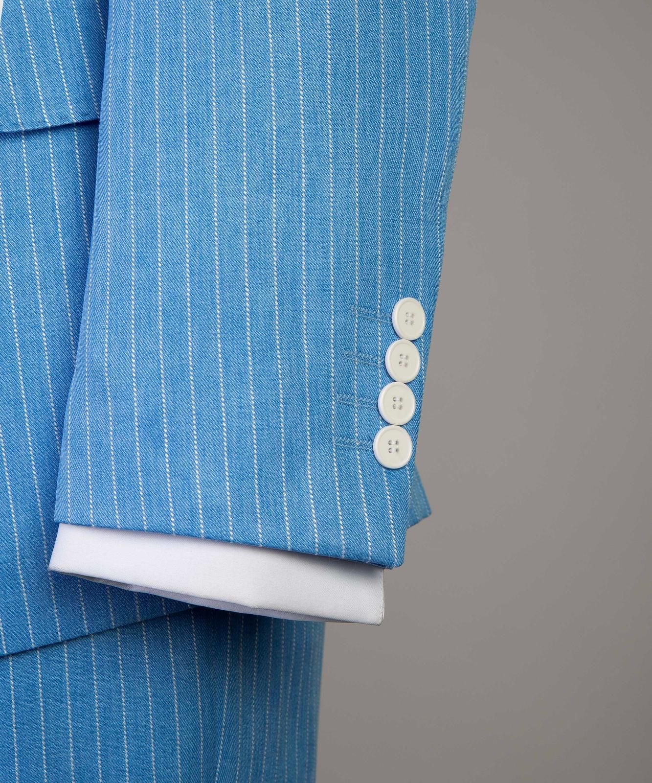 Single-button striped suit featuring a wide Italian-cut lapel for a refined and stylish look. The white button details add a sporty, summer-season vibe. side pockets offer both elegance and practicality. paired with matching striped trousers to complete the sophisticated ensemble.
