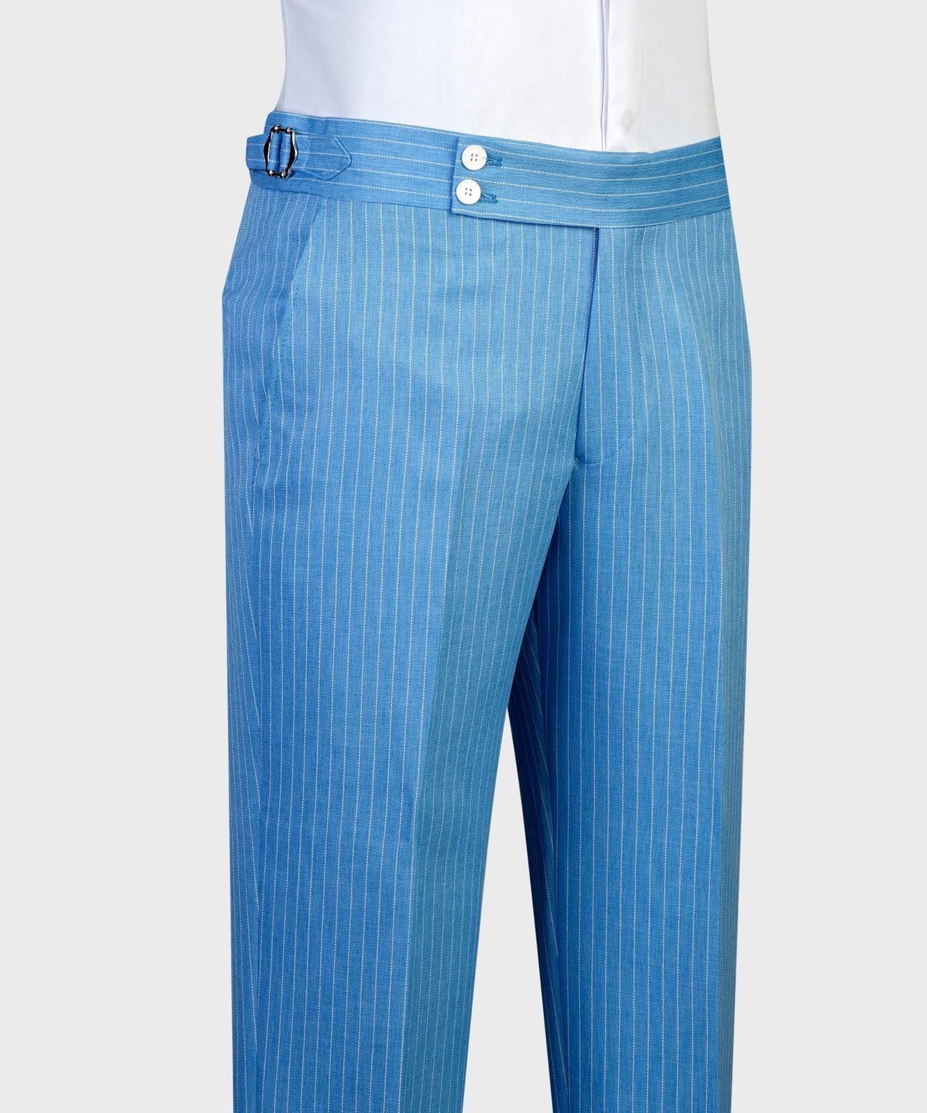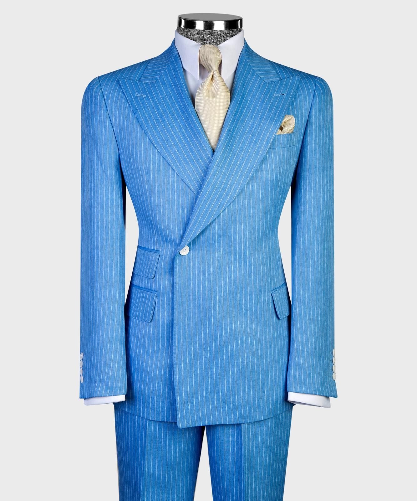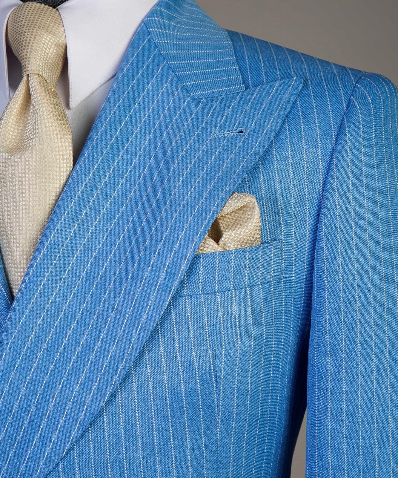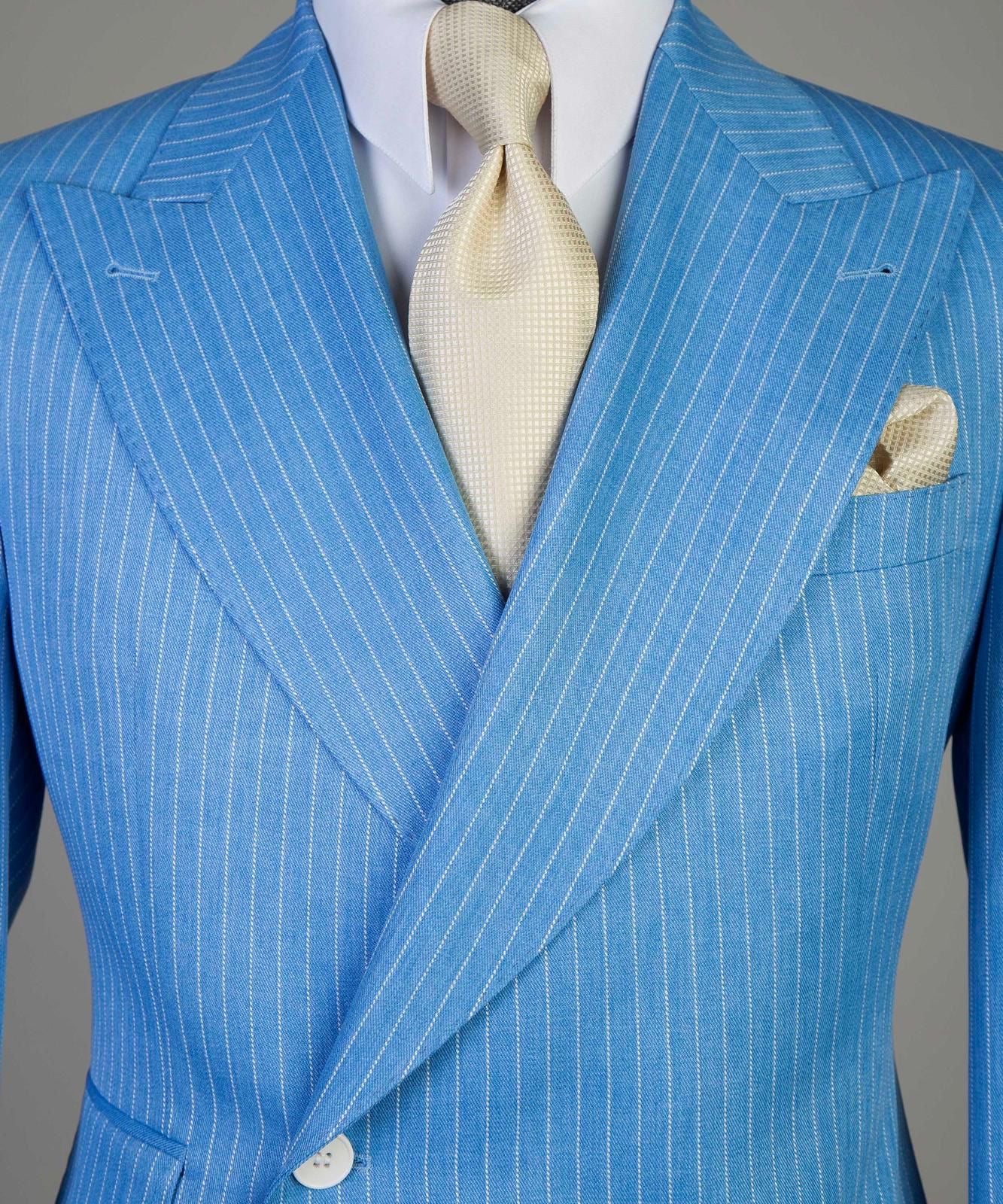 Single-button striped suit featuring a wide Italian-cut lapel for a refined and stylish look. The white button details add a sporty, summer-season vibe. side pockets offer both elegance and practicality. paired with matching striped trousers to complete the sophisticated ensemble.