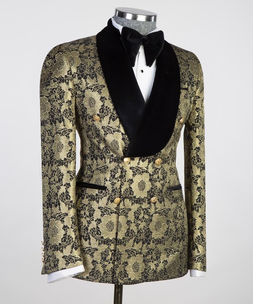 This Two pieces Suit by JM Menswear.Created in silk-wool for a luxurious feel, this modern suit is cut to a relaxed fit and comprises trousers and a double-breasted jacket with silk accents throughout. It comes with black tuxedo pants.