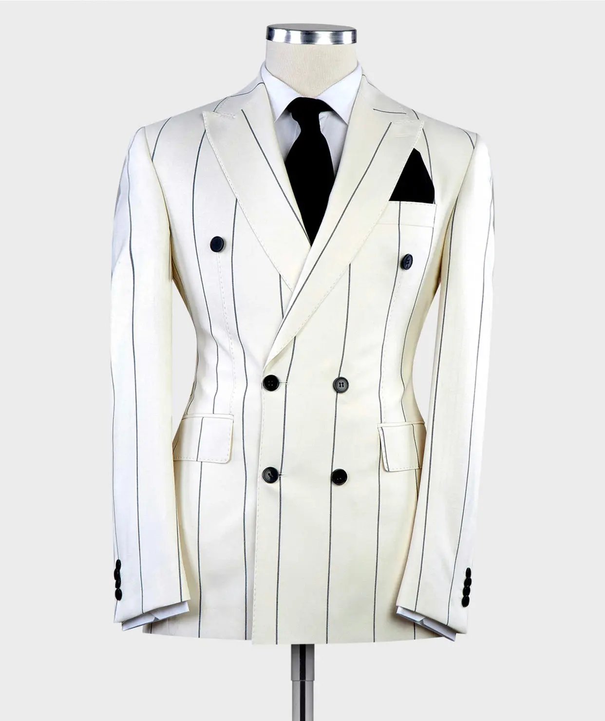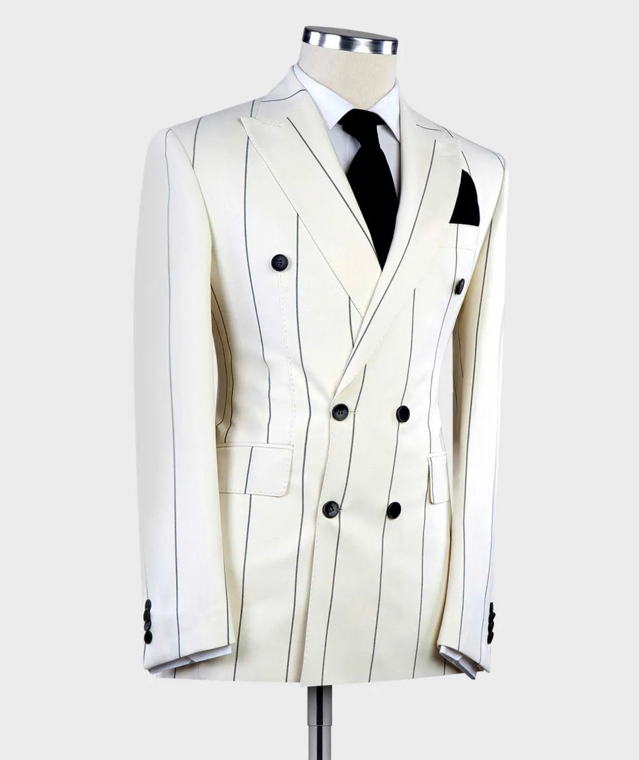 Casual striped suit, by JM Menswear.Created in silk-wool for a luxurious feel, this modern suit is cut to a relaxed fit and comprises trousers and a double-breasted jacket with silk accents throughout. Complete the look with JM Menswear accessories for effortless refinement.